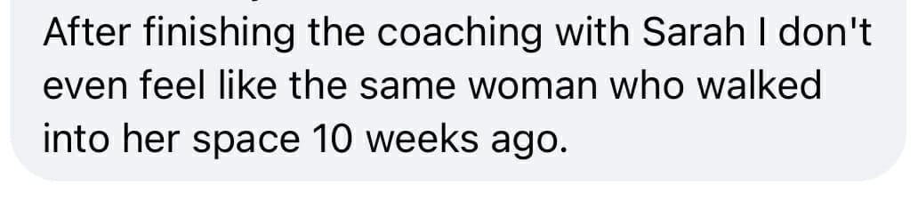 "Sarah is so knowledgeable and passionate about supporting clients to become the very best version of themselves. After finishing the coaching with Sarah I don't even feel like the same woman who walked into her space 10 weeks ago. Highly recommend to anyone who may feel like they need some guidance or change in their lives."